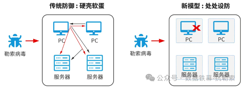传统方案:一旦边界被突破,攻击者可在内网长驱直入,攻击的“爆炸半径”覆盖了整个网络,导致“一点突破,全网失陷”。